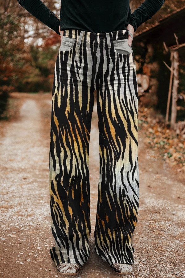 Retro Western Cowboys Zebra Print Washed Wide Leg Pants