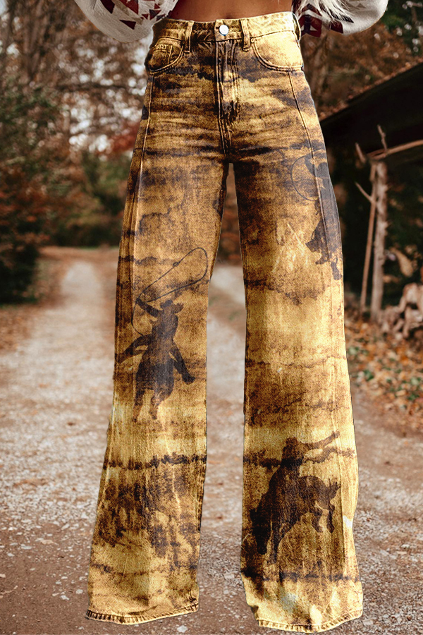 Retro Western Cowboy Horse Racing Print Wide Leg Pants