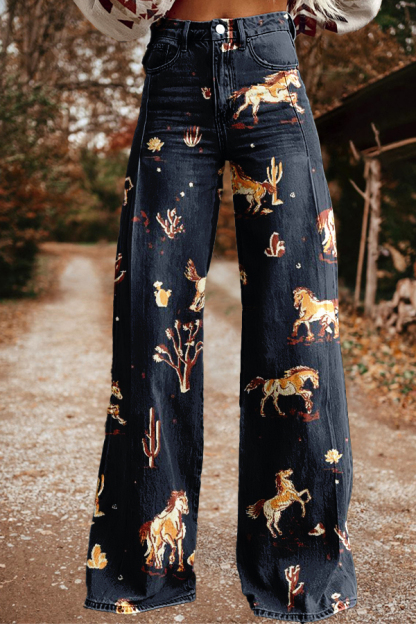 Western Cowboy Horse Racing Print Wide Leg Pants