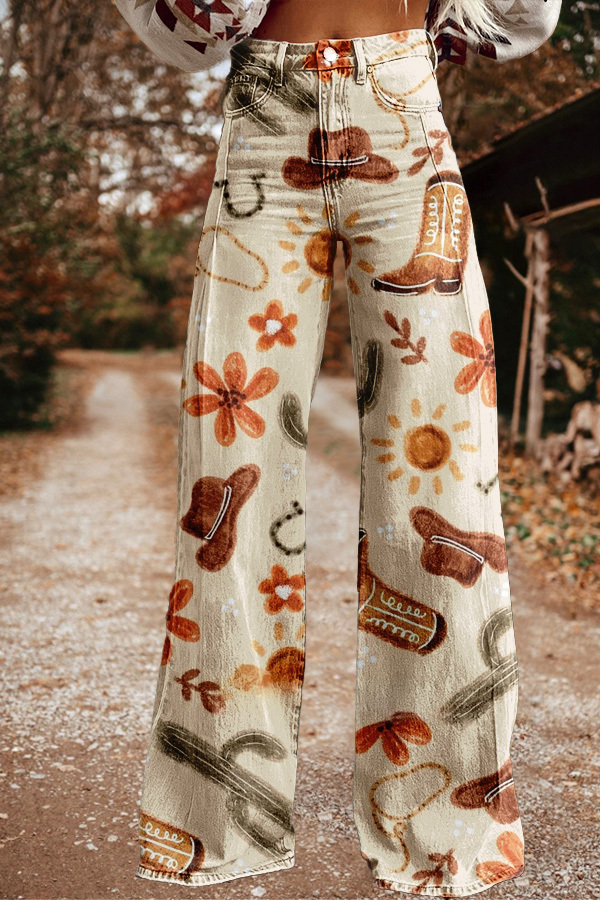 Vintage Western Cactus Print Wide Leg Trousers