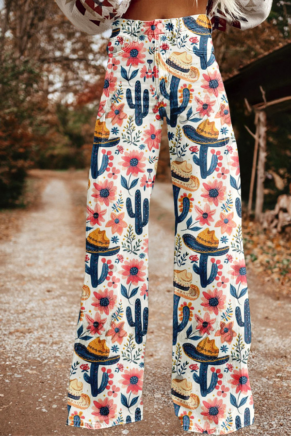 Vintage Western Cactus Print Wide Leg Trousers