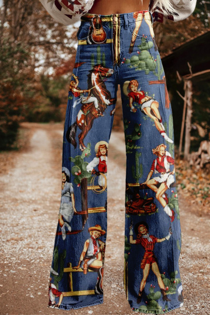 Vintage Western Rodeo Print Wide Leg Trousers