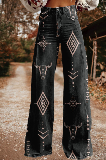 Vintage Western Bullhead Print Wide Leg Pants