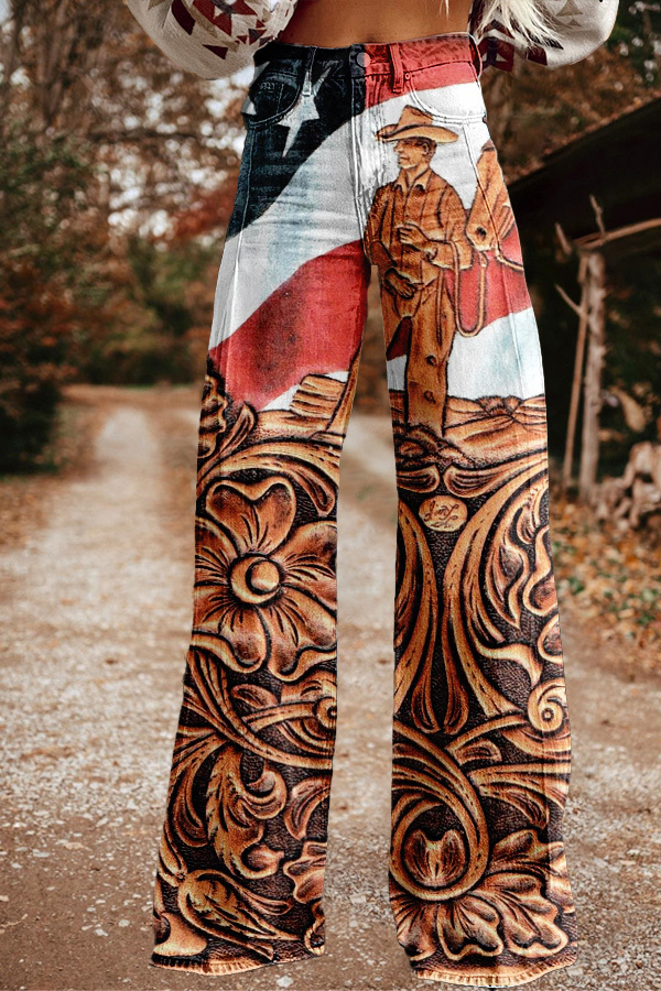 Vintage Western Floral Print Wide Leg Trousers