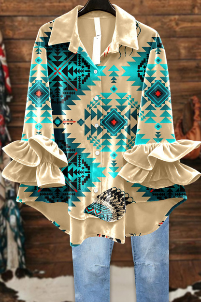 Western Turquoise Aztec Velvet Ruffle Top