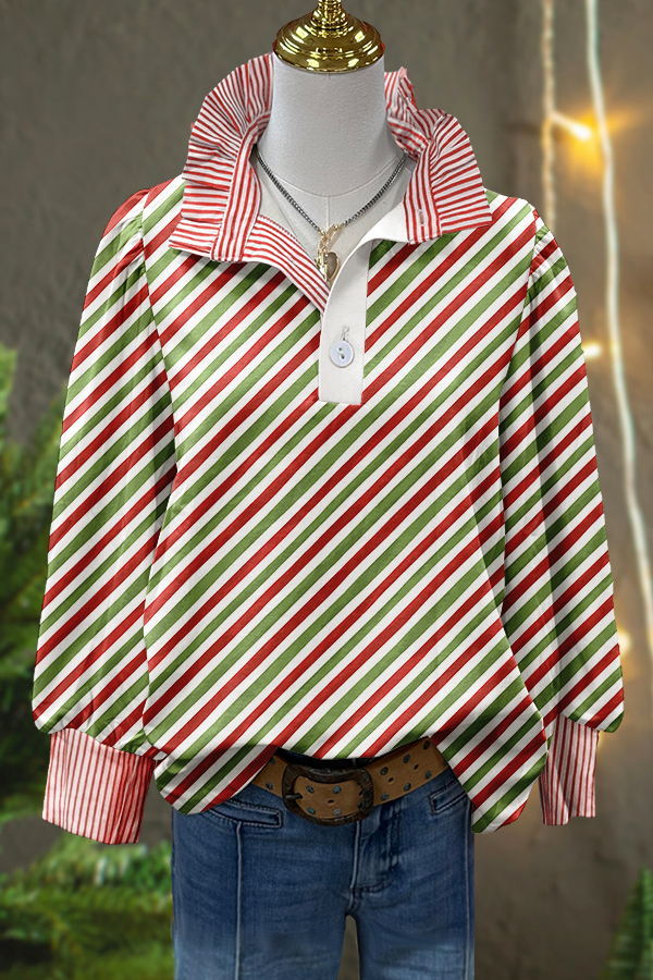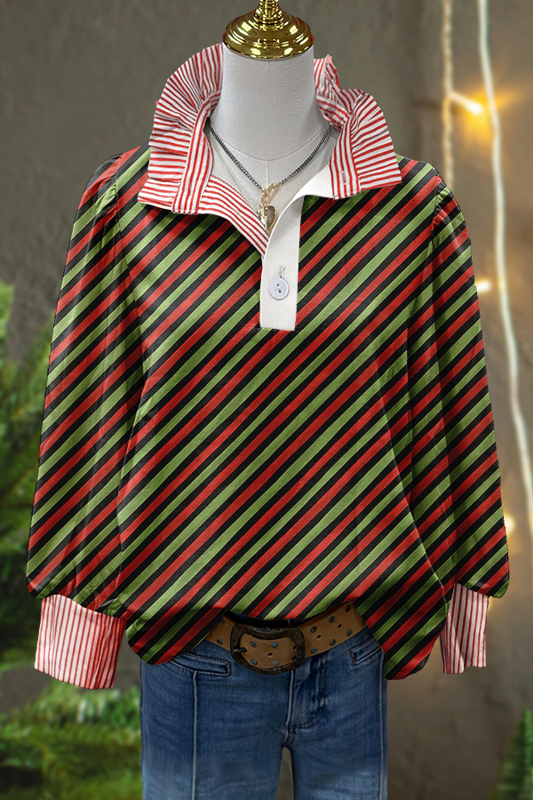 Classic Christmas Print Stripe Puff Sleeve Blouse
