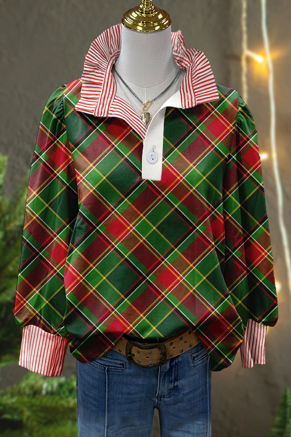Classic Christmas Plaid Print Stripe Puff Sleeve Blouse