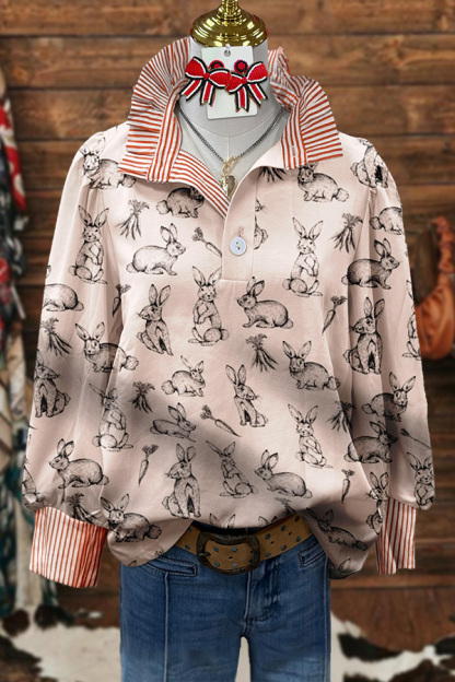 Vintage Easter Bunny Print Puff Sleeve Blouse