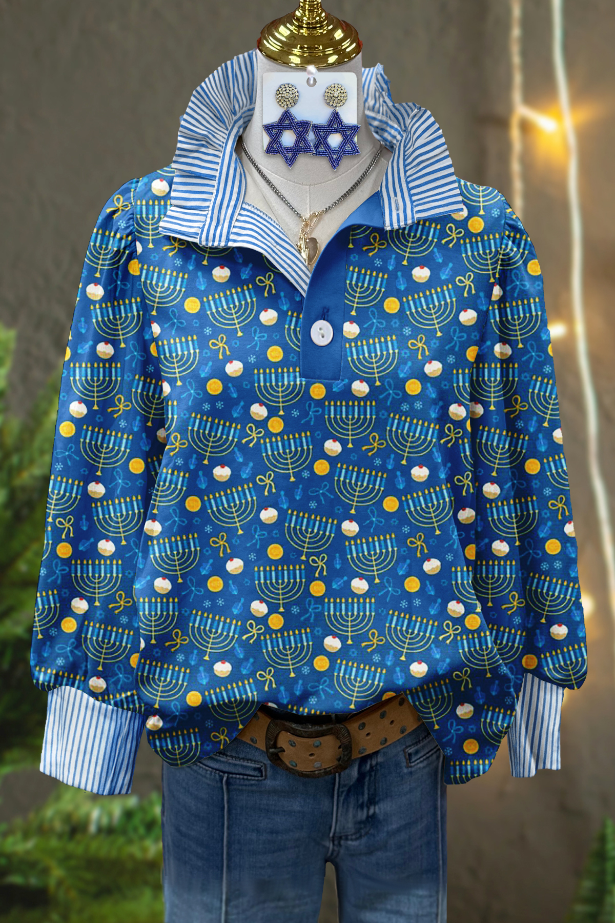 Classic Hanukkah Print Striped Stand Collar Blouse