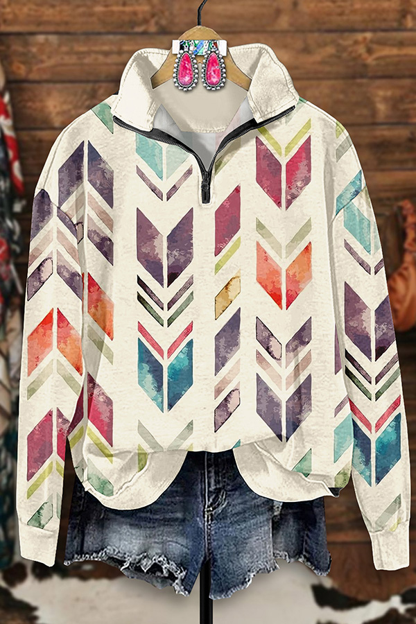 Retro Western Aztec Arrow Print Zip-Up Sweatshirt