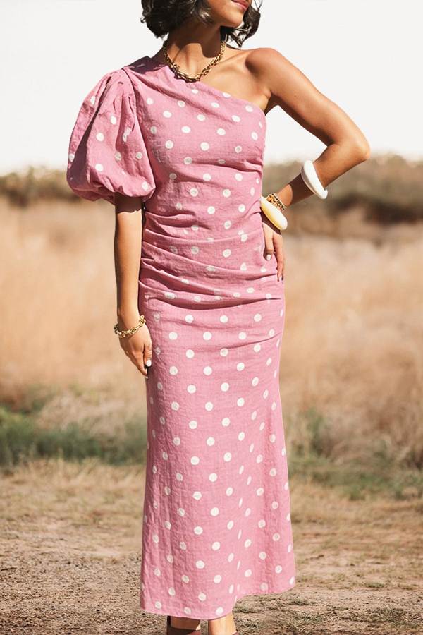 Polka Dot One-Shoulder Puff Sleeve Maxi Dress
