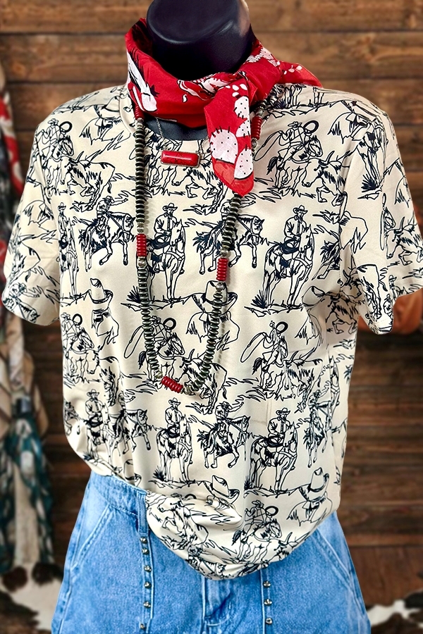 Stay on trend this season in our new casual, round neck t-shirt. We especially love the graphic print fabric and think this piece will be a new favorite in your closet!