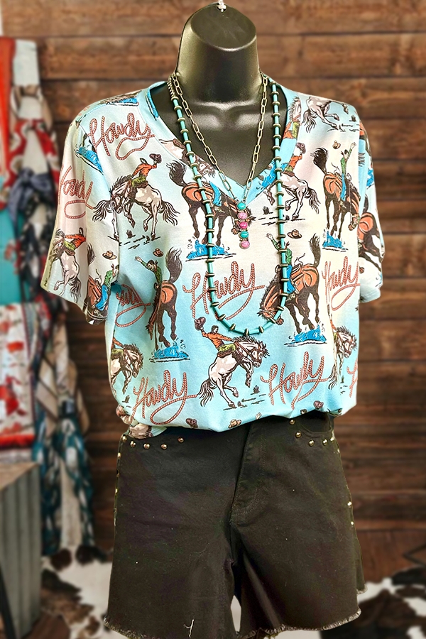 Stay on trend this season in our new casual, v neck t-shirt. We especially love the graphic print fabric and think this piece will be a new favorite in your closet!