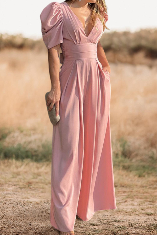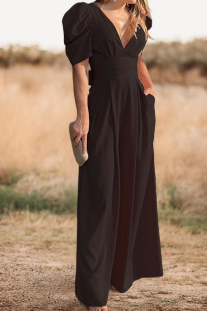 V-Neck Puff Sleeve Wide Leg Jumpsuit