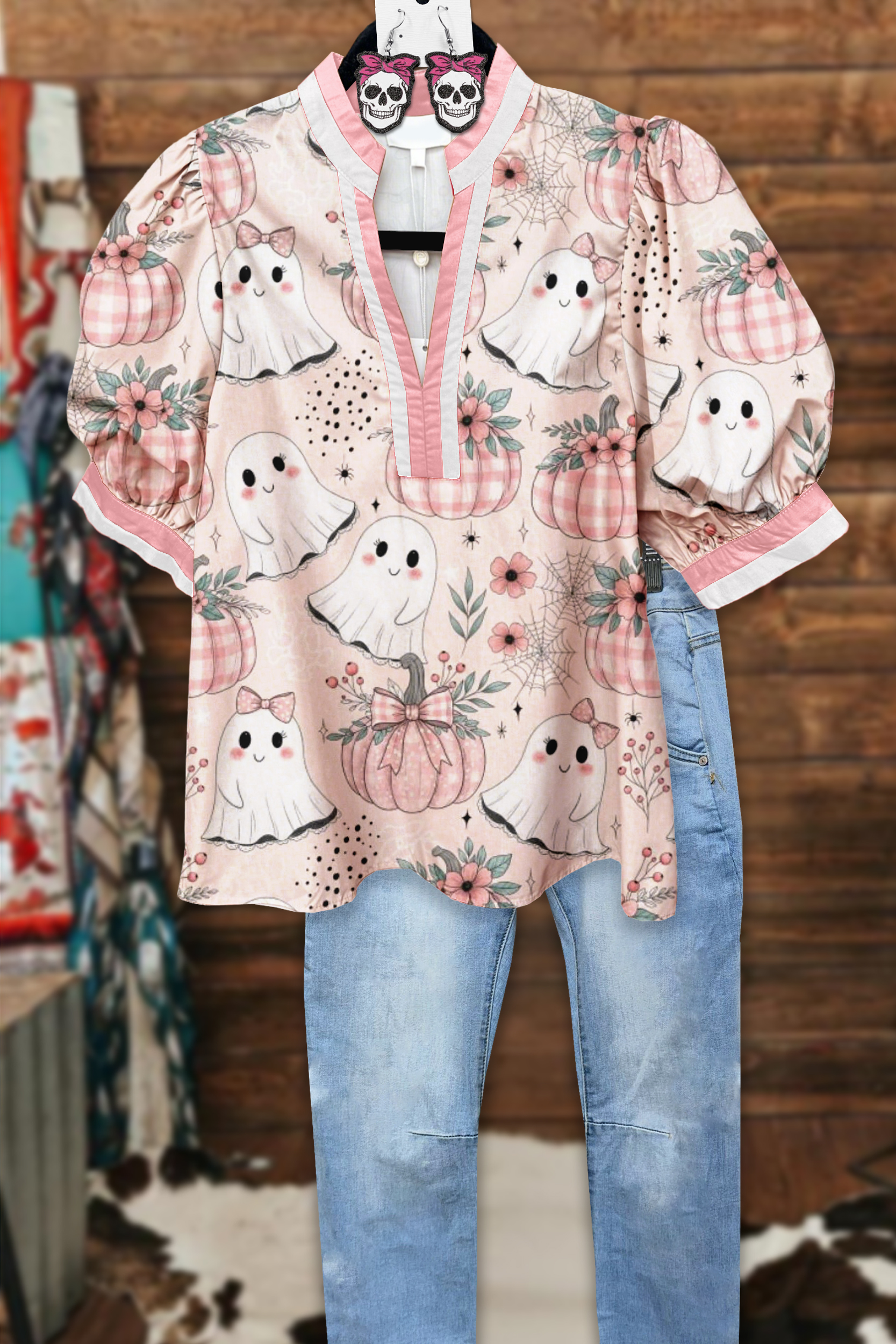 Cute Halloween Ghost Pumpkin Puff Sleeve Blouse