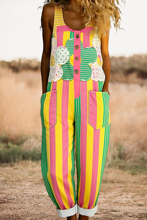 Floral Stripe Sleeveless Overalls