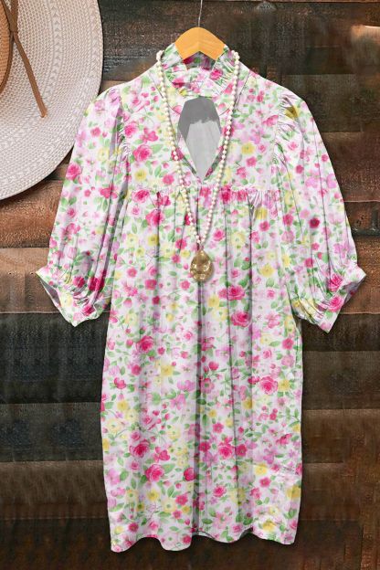 Stay on trend this season in our new retro, v neck dress. We especially love the flower print fabric and think this piece will be a new favorite in your closet!