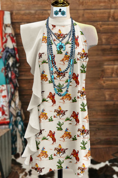 Western Riding Cowboy Print Asymmetric Ruffle Dress
