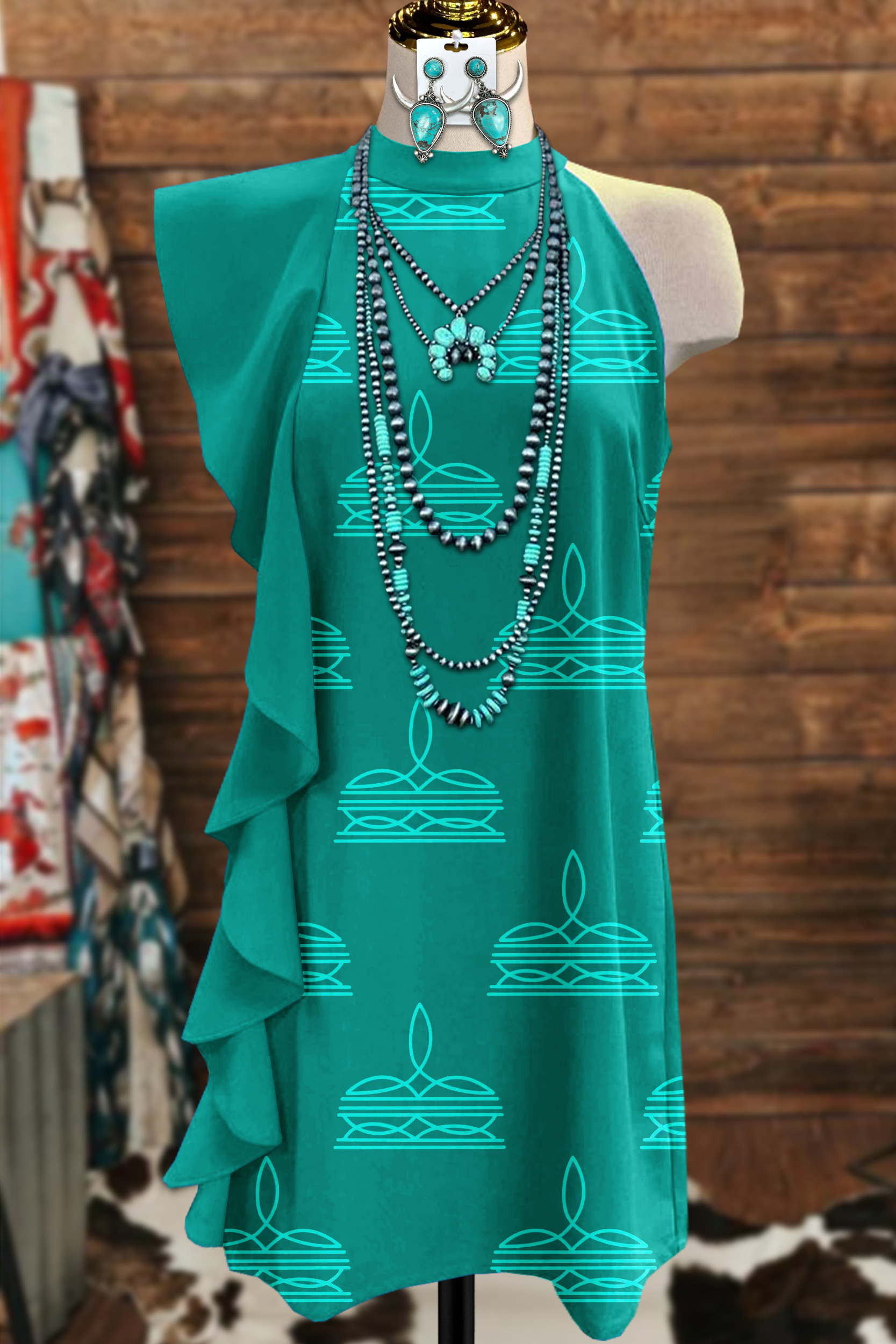 Western Boot Stitch Print Asymmetric Ruffle Dress